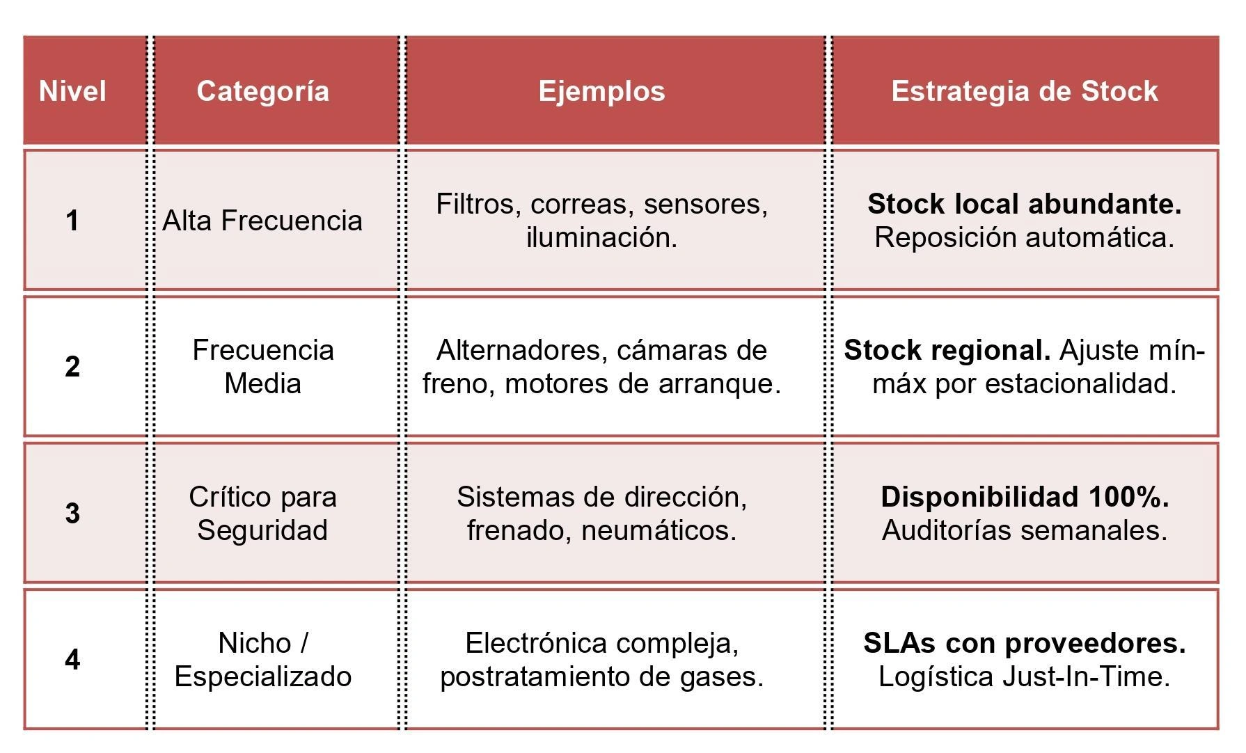 Implica la organización del inventario según la frecuencia de falla y el impacto en el tiempo de actividad. Este enfoque permite segmentar el almacén en cuatro niveles estratégicos: